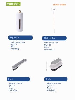 选你所选,如你所愿 Cup holder Cloth reacher Model No.:MK-QBQ Model No.:MK-103 Qty/CTN: Qty/CTN: Meas.: Meas.: 20GP/40HQ: 20GP/40HQ: Brush Brush Model No.:MK-XS07 Model No.:MK-YS08 Qty/CTN: Qty/CTN: Meas.: Meas.: 20GP/40HQ: 20GP/40HQ: